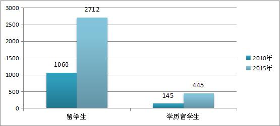 随着学生出国境项目、交流学习人数日益增加,来广外留学学生人数也成倍扩大。2015年我校共招收来自130个国家的留学生2712人,约占计划内学生总数的12%。较2010年翻了一番多;其中学历留学生从145人增加到445人,增加了2倍。