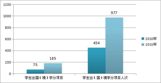 目前我校拥有各类学生出国(境)学分项目185个,相比2010年,我校2015年的各类学生出(国)境人数增长了53.5%。截至2015年12月31日,我校与43个国家和地区的305所高校和其他机构建立了交流合作关系,“十二五”期间,共4090名在校学生出国(境)访学,比“十一五”增长223%。